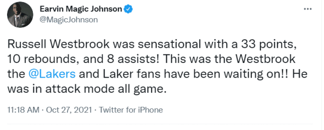 湖人名宿“魔术师”约翰逊也在赛后更新社媒,为威少送出赞美:“33分10篮板8助攻,拉塞尔-威斯布鲁克太不可思议了,这才是湖人和湖人球迷一直期待的威斯布鲁克!他一整晚都处于攻击模式下!”