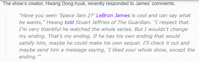 《鱿鱼游戏》的导演黄东赫显然听到了詹姆斯的言论。在接受媒体采访时,黄东赫对记者说道:“你看过《空中大灌篮2》吗?勒布朗-詹姆斯很酷,他当然可以说自己想说的话。我尊重他的观点,我很感谢他观看了整部剧集。但我不会更改我的结局,那就是我的结局。如果他对结局有自己的想法,可以让他感到满意,也许他应该去拍一部续集。我会去看,并可能给他发条信息,上面写着‘我喜欢你的整部剧,除了那个结局’。”