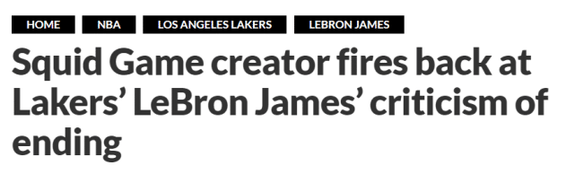 詹姆斯和浓眉曾经在记者会上讨论过《鱿鱼游戏》。当时,詹姆斯表示自己对结局非常不满:“我不喜欢这个结局,虽然我知道这是为第二季做准备,但主角到底在干嘛?坐上那该死的飞机,去见你的女儿,你在搞什么?”