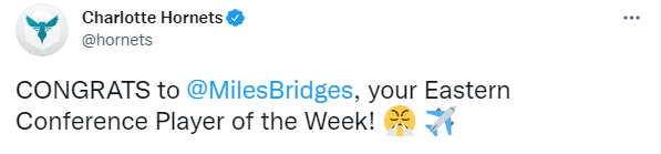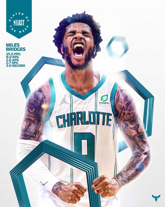 黄蜂球员布里奇斯上周场均拿到25.0分8.0篮板2.7助攻,也带领球队拿到3胜0负的战绩,暂时排名东部第二,黄蜂官方第一时间晒照恭喜布里奇斯当选东部周最佳球员,生涯首次当选东部周最佳。