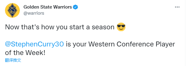 勇士官方第一时间恭喜库里,晒照并且发推写道:现在这就是你开始一个赛季的方式恭喜库里成为西部周最佳球员!