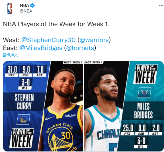 NBA官宣周最佳!西部库里场均31+9+7,黄蜂新星生涯首次当选