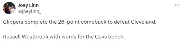 主场大战骑士,快船上半场的进攻不佳而且防守十分糟糕,半场59-80落后多达21分;下半场,快船第三节落后26分后绝地反击,打出16-3的反击高潮;末节卢指导直接弃用哈登,继续让乔治+鲍威尔+科菲+普拉姆利+威少的阵容带队追分。