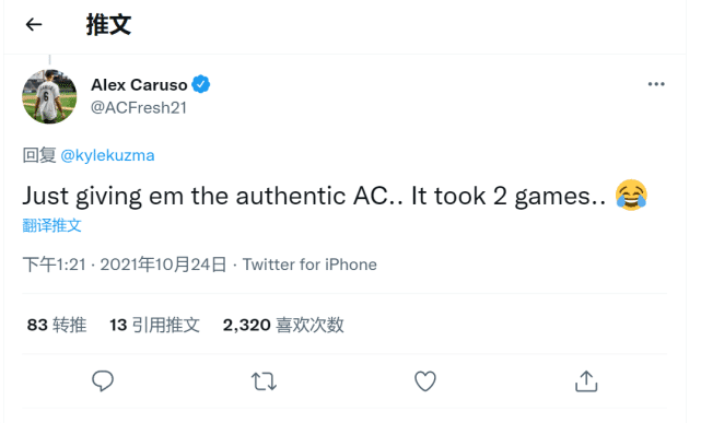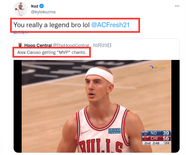 而卡鲁索刚刚回复了库兹马:只是给他们(芝加哥)纯正的卡皇,这只花了两场比赛,笑哭。