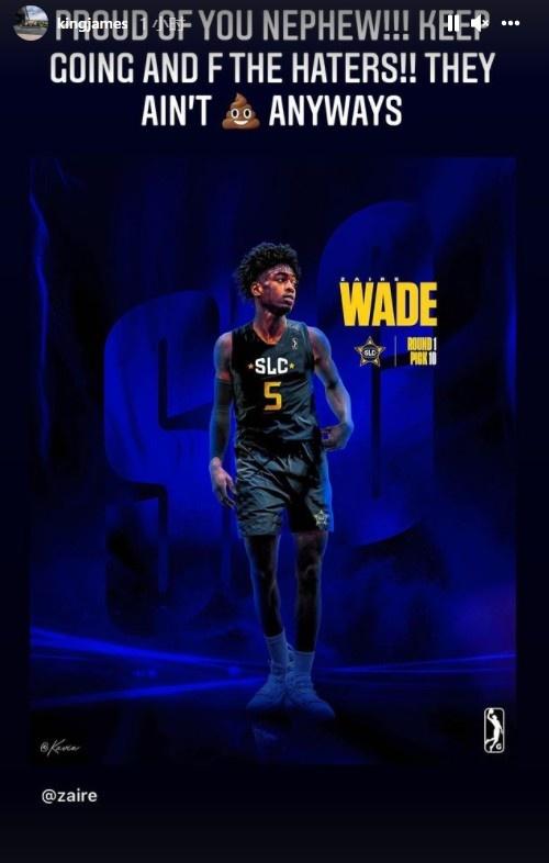 盐湖城星队(爵士下属)在第十顺位选中了球队小老板韦德的儿子,扎伊尔·韦德!闪电侠之子曾也被称之为天之骄子,但事实证明天赋平平,若不是有老爸的关系很难被关注!不过他被选中后韦德就发文表示自豪,詹姆斯、追梦格林、克劳德、小托马斯、迈克尔-比斯利等球员纷纷评论祝贺,老詹发文“为你感到骄傲,侄子!!!继续前进,然后f**k那些黑子们!!反正他们什么都不是。”