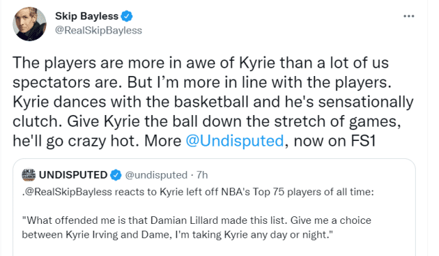 除了谈论威少,斯基普-贝勒斯还为欧文打抱不平。在NBA官方公布的75周年阵容中,没有欧文的名字。他说道:“让我感到冒犯的是利拉德入选了。如果让我在欧文和利拉德之中选择,不管什么情况我都会选择欧文。”