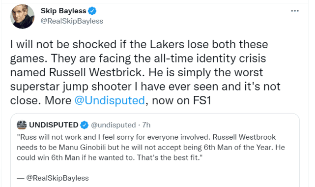 来源:JRS直播网10-23 19:29JRS直播网10月23日讯 ,名嘴斯基普-贝勒斯在最新一期节目中谈到了威斯布鲁克。威少在湖人揭幕战表现不佳,只得到8分5篮板4助攻,投篮13中4,正负值-23排名全队倒数第一。贝勒斯不看好威少的前景,建议他改打替补。