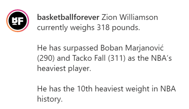 锡安的身高是2米01,博班是2米24,法尔是2米26,锡安的体重已经超过了NBA的两大巨人。锡安目前还在养伤状态,休赛期他接受了一次脚部手术,修复骨折的第五跖骨。上赛季,锡安的官方体重数据是284磅(约128公斤)。美媒B/R之前报道称锡安体重已经突破300磅,没想到确切的数据出来更加惊人,318磅的体重,让大家对他未来的膝盖和脚部的承受力更加担忧。这意味着过去一年,他的体重又增加了16公斤。