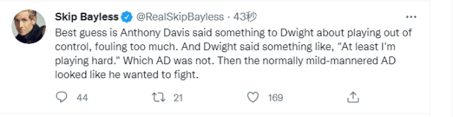 随后他也是分析到两人冲突的原因,他写道:“我觉得两人冲突最可能的原因,就是浓眉对霍华德说你需要控制动作,我们的犯规太多了,霍华德也许回喷道,我打得可比你硬多了。”
