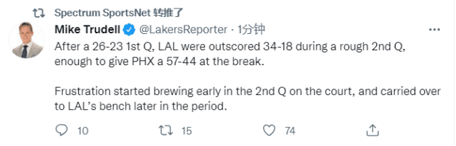 Mike Trudell则是给出了相对靠谱的预测,他表示:“首节26-23领先的情况下,湖人被对手轰出了一波34-18。沮丧的情绪,从第二节伊始便从球场蔓延到了板凳席。”