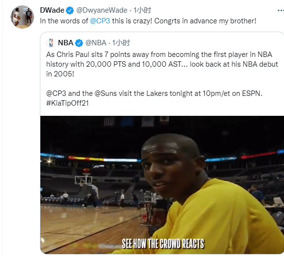 在太阳和湖人赛前,NBA官方为保罗破纪录而预热,热火名宿韦德提前恭喜保罗,发推写道:用保罗的话来说,这很疯狂!提前祝贺我兄弟!