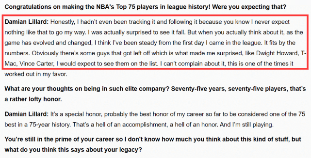 对于自己入选75大,利拉德在接受采访时表示自己也很惊讶。“说实话,我之前甚至没有怎么关注这件事,我从来没有想过这样的事情会发生在我身上,但是当你仔细想想,随着比赛的发展和改变,我从进入联盟的第一天起就一直很稳定,数据也符合这一点。有些球员没有入选让我感到惊讶,比如说霍华德、麦迪和卡特,我希望能在名单上看到他们,这是其中一次对我有利的结果。”利拉德说道。