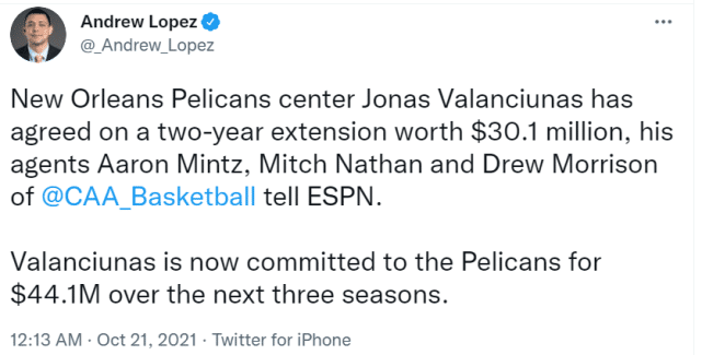 来源:JRS直播网10-21 16:14JRS直播网10月21日讯 ,据ESPN记者Andrew Lopez报道,瓦兰丘纳斯与鹈鹕提前续签了一份2年3010万美元的合同,算上他余下的1年合同,未来3年,瓦兰丘纳斯的合同是3年4410万。