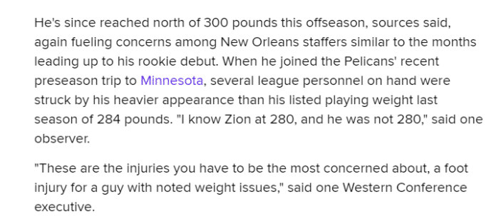 今年休赛期,21岁的锡安接受了右脚骨折手术,还没有具体的复出时间表;很明显在养伤期间,锡安又胖了不少,不仅球队工作人员为他而担忧,西部某高管也担心伤病让他的职业生涯蒙上阴影。
