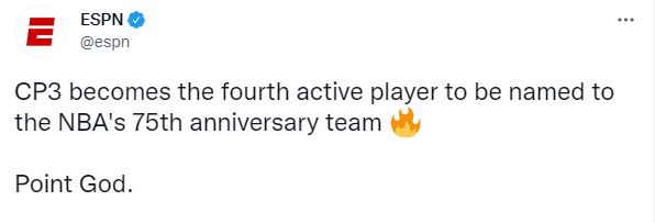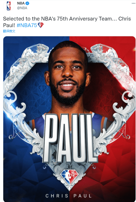 NBA官宣太阳球星保罗入选75大球星榜,跻身历史最伟大球员行列;美媒ESPN第一时间恭喜保罗成为现役第四位入选历史75大球星的球员,并写道:控卫之神!
