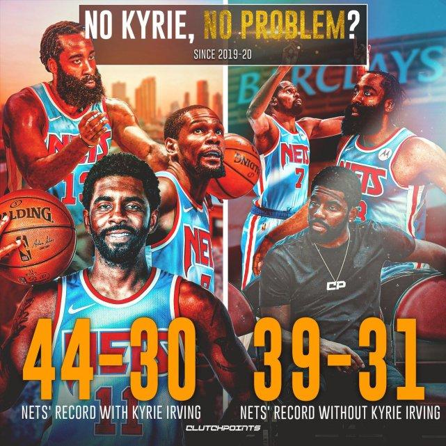 在篮网三巨头中,只有杜兰特提前续签了4年1.98亿美元的合同。哈登已经拒绝和篮网提前续约,欧文由于不愿接种疫苗,他和篮网的续约谈判也已经中止。没有欧文,会给篮网造成多大影响?美媒clutchpoints晒出了数据:自从2019-20赛季以来,欧文为篮网出战74场,44胜30负,他没打的70场,篮网39胜31负,差别看上去并不大。