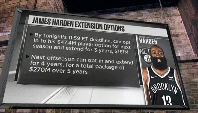 在截止时间到来前,如果不离开篮网,摆在哈登面前的其实就是两个选择。选择一,就是执行下赛季4740万美元的选项,然后再和篮网提前续签3年1.61亿美元。选择二,就是不和篮网提前续约,等到明年休赛期再执行4740万美元的合同选项,然后再和篮网续约4年,总合同就是5年2.7亿美元。