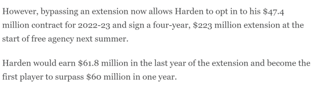 薪金专家鲍比-马克斯解释了哈登合同的特殊性。他和队友欧文不同,哈登无法拒绝球员选项后续约,因为根据劳资协议,他的续约第一年薪水,会低于原先的选项薪水。