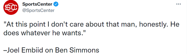 恩比德还说:“坦白说,我不在乎那个人(西蒙斯),他爱干嘛干嘛,但我们只是专注于胜利,让球队变得更强。”