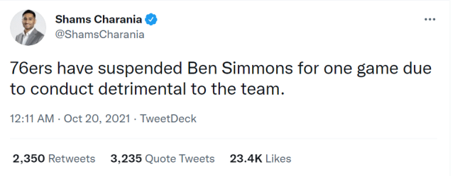 里弗斯也表示:“我认为西蒙斯今天的行为会让其他球员分心。他不想和其他球员一样完成训练内容。现在还早,不是大问题,我就是告诉他该离开了,然后我们继续训练。”里弗斯表示自己愿意再给西蒙斯机会,如果球队在首战后第二天有训练,西蒙斯会被允许参加。
