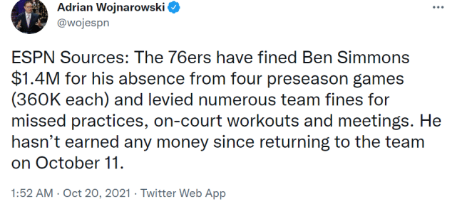ESPN报道称,76人因西蒙斯缺席4场季前赛和训练,已经罚掉他140万美元。揭幕战遭遇禁赛,意味着西蒙斯又将损失22.7万美元。西蒙斯和费城的闹剧将如何收场?他能被交易走吗?让我们拭目以待。