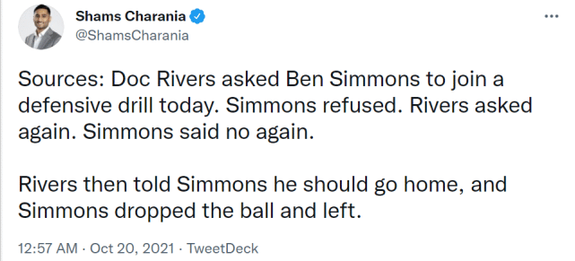 查拉尼亚报道称,里弗斯今天让西蒙斯参加一次防守训练,被西蒙斯拒绝,里弗斯再次提出要求,西蒙斯再次拒绝。随后,里弗斯告诉西蒙斯应该回家了。西蒙斯扔球后离开。