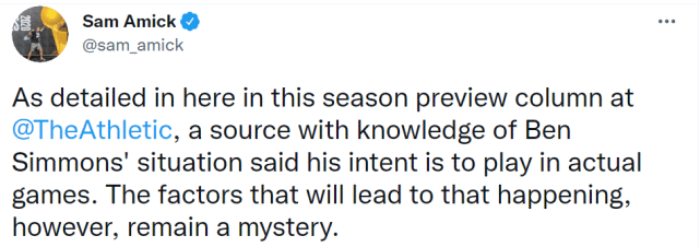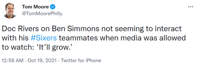 被问到西蒙斯训练中与队友的互动不多的问题时,里弗斯的回复是“会好起来的”,他还表示暂时不确定西蒙斯能否出战常规赛揭幕战。