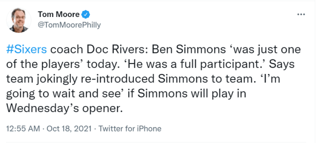 里弗斯还在训练前开了个玩笑,向大家重新介绍了西蒙斯。里弗斯表示这是球队的习惯,欢迎回归的老面孔。此前,他们也曾对托比亚斯-哈里斯和塞布尔做过相同的事。谈到西蒙斯能否出战常规赛的揭幕战,里弗斯说:“我还不知道,我想等等看。目前来看,他的状态不错,但还没达到比赛状态。当他做好准备后,他就能出场了。”