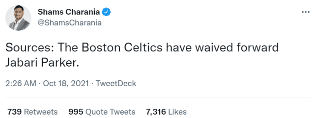通过裁掉帕克,凯尔特人的阵容灵活性提升,他们空出了一个常规阵容名额,与此同时,他们还有一个双向合同名额,可以留在赛季期间进行补强。