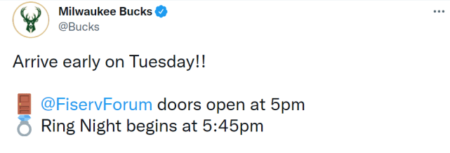 常规赛揭幕战,雄鹿将在主场迎战篮网。赛前,雄鹿将举行颁奖典礼,球员、教练、工作人员都将领到2020-21赛季的NBA总冠军戒指,他们还将升起总冠军旗帜。雄鹿官方晒出了当天的仪式细节,并公布球馆将于当晚5点开放,“戒指之夜”将于5点45分开启。官方号召球迷“都来早一些”。对于篮网球员来说,就有些扎心了,他们不得不在现场见证对手的这些荣耀时刻。