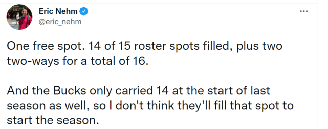 来源:JRS直播网10-18 11:55JRS直播网10月18日讯 ,据密尔沃基记者Eric Nehm报道,雄鹿已经敲定了新赛季的16人名单,其中包括常规阵容的14位球员和双向合同的2位球员。和上赛季一样,雄鹿在常规阵容中留了一个空缺名额,他们有可能在赛季期间再视具体需求签人。