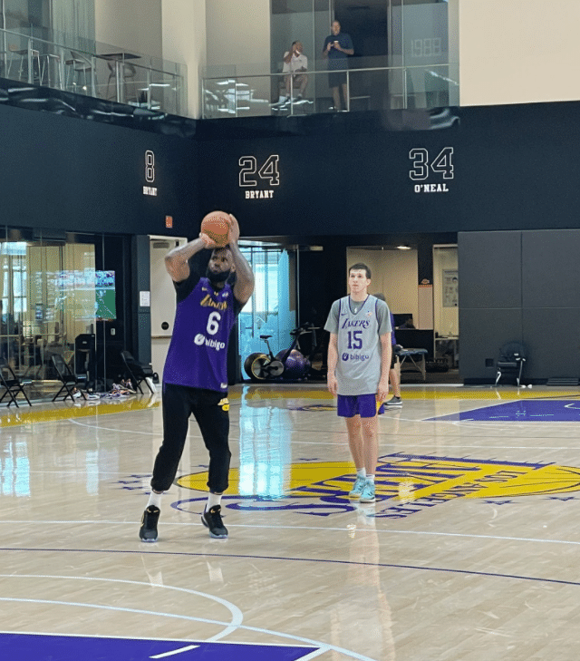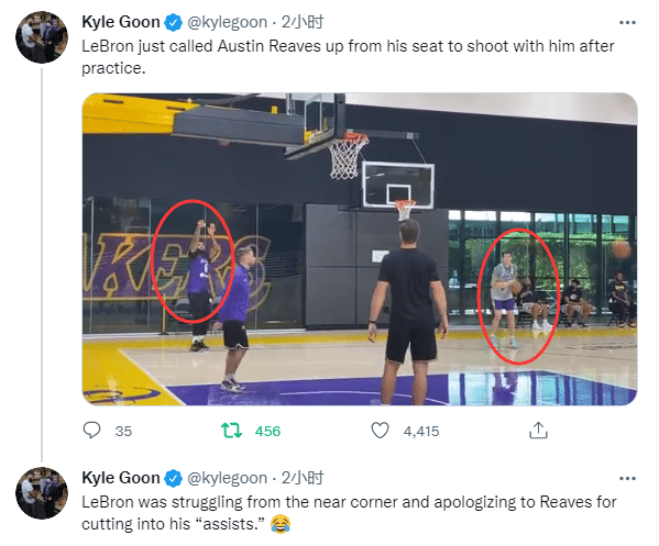 据名记kyle goon报道,在训练结束之后,詹姆斯把里夫斯从座位上叫到球场上,让他和自己一起继续加练三分球;詹姆斯站在底角,接里夫斯传球后投篮,里夫斯则是站在45度角附近,先是自己投一球,然后“助攻”詹姆斯。