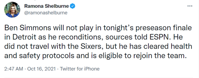 Shelburne在文中写道:“西蒙斯没有参加球队的投篮训练,因为他告诉球队,自己可能接触到了球队的一位按摩师,而之前这位按摩师的新冠检测结果是不确定的。一些球员被问及他们是否在那天上午看到那位按摩师,大家的答案都是否定的,只有西蒙斯说他见到过。”