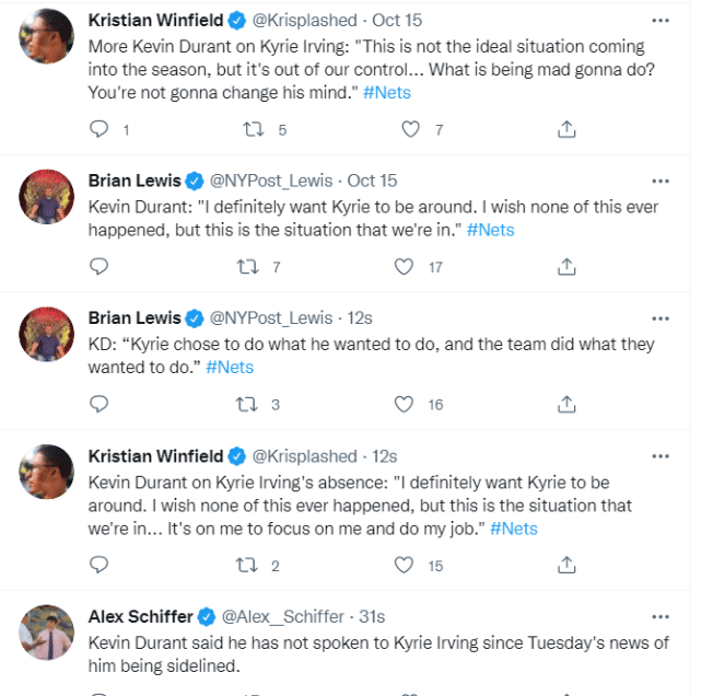杜兰特承认,欧文的话题会整个赛季伴随着球队,没必要对这件事有什么过激反应。他能理解(报道欧文的事情是)媒体的工作,但球队也得专注于做好他们的工作。
