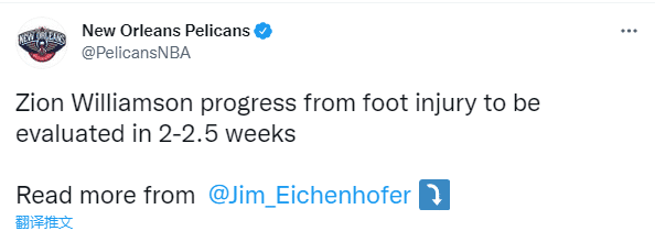 来源:JRS直播网10-15 17:02JRS直播网10月15日讯 ,新奥尔良鹈鹕队官宣锡安的伤情复查结果,右脚术后康复进展令人乐观,他将在2-2.5周内再次接受评估,暂无具体复出时间表;21岁锡安又伤了,至少伤停2周将缺席新赛季揭幕战以及第一周的比赛,医学专家表示锡安不能提前复出,否则会遭遇杜兰特式悲剧。