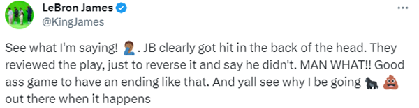 勒布朗-詹姆斯发推写道:我说什么来着,杰伦后脑勺明显被打到了啊。他们(裁判)回看录像后却说他(希尔德)没打到。兄弟,有没有搞错啊!!这场比赛就TM这么结束了。你们都知道我在看到这种事发生后为什么那么气愤了吧。