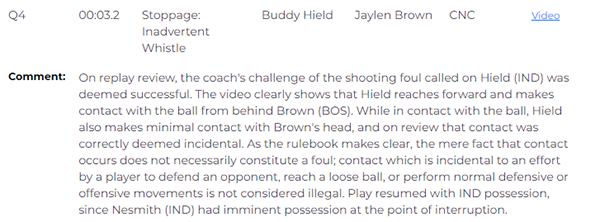 对于关键时刻的争议判罚,NBA裁判报告解释:步行者挑战成功,回放显示,希尔德向前伸手,从布朗身后碰到篮球,在与球接触时,希尔德很少地碰到了布朗的头部,这种偶然接触不构成犯规,当时步行者控制球权,因此比赛恢复后球权属于步行者。