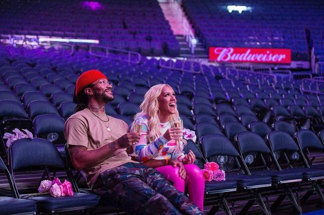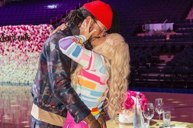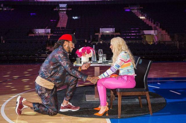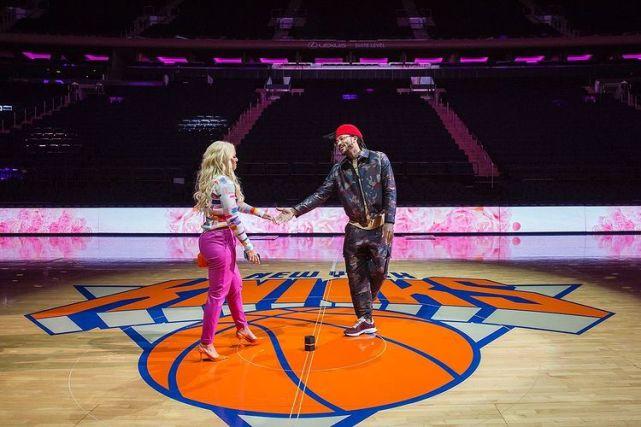 在摄影师的照片上,偌大的麦迪逊广场花园的球馆里,只有罗斯和阿莱娜的身影。他们在浪漫的氛围里共进晚餐,罗斯单膝下跪向阿莱娜求婚,送上了一枚大钻戒。两人在鲜花前合影,甜蜜拥吻。