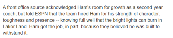 据消息人士透露,湖人聘请哈姆是因为他的性格、坚韧和存在感——他们非常清楚,在湖人的领域,聚光灯可以是灼热的。哈姆得到了这份工作的部分原因是他们相信他能承受得住这种压力;作为一名第二年的主教练,哈姆还有成长的空间。