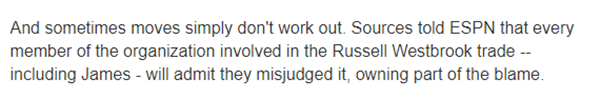 McMenamin透露,湖人球队中包括詹姆斯在内的每一个参与了威少交易的人都会承认自己的错判并承担责任,威少在湖人队根本不起作用。