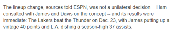 12月22日输给森林狼遭遇4连败后,哈姆主动变阵让拉塞尔替补,并且派出詹姆斯、浓眉、范德比尔特、雷迪什、普林斯的五锋线首发阵容;据报道,哈姆采取五锋线阵容并不是他单方面的决定,为此他咨询了詹姆斯和戴维斯的意见;哈姆祭出死亡五大后击败雷霆从而止住颓势,詹姆斯拿到赛季新高的40分。