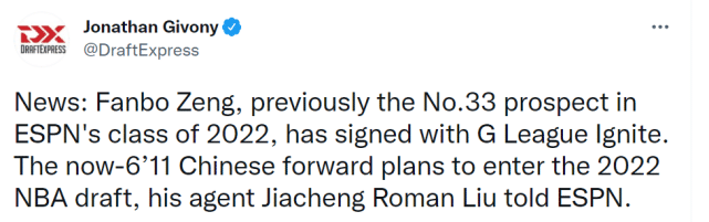 来源:JRS直播网10-14 15:41JRS直播网10月14日讯 ,据ESPN选秀专家Jonathan Givony报道,曾凡博的经纪人刘家成透露,曾凡博计划参加2022年NBA选秀。此前在ESPN的选秀预测榜上,曾凡博一度名列第33位。