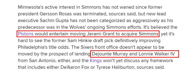 森林狼对西蒙斯的兴趣一直没有减退,昔日的篮球运营总裁罗萨斯下课后,新任总裁古普塔仍在继续努力追逐西蒙斯。活塞有兴趣用杰拉米-格兰特来换西蒙斯,不过,作为76人的旧将,格兰特并不被看好能增加费城的夺冠概率。马刺方面能提供穆雷和朗尼-沃克,但76人不感兴趣。国王方面,依然坚持不把福克斯或者哈利伯顿放进报价里。