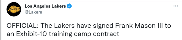 湖人记者哈里森-费根解读这笔操作,他指出两名球员都不会出现在湖人新赛季的阵容中。梅森三世签下的Exhibit 10合同只是为了方便G联赛的南湾湖人签下他,他有可能成为湖人的备胎。