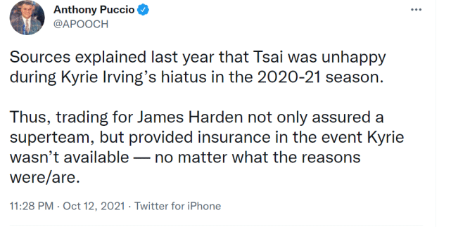 来源:JRS直播网10-13 19:32JRS直播网10月13日讯 ,篮网记者Anthony Puccio报道称,消息源透露,早在2020-21赛季,欧文因故缺席比赛时,篮网老板蔡崇信就已经不高兴了。他同意球队换来哈登,一方面是为了打造超级球队,另一方面就是为欧文准备一份保险,不管他未来因为什么原因缺席。