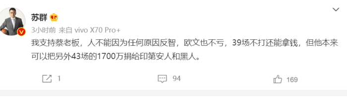 名嘴苏群第一时间也点评了此事,他表示力挺蔡老板,同样认为他们给足了欧文面子,尤其在钱的方面,既不同意他兼职打客场的比赛,还会给他发这部分的工资!不过最后一句话有意思,明显调侃欧文,他不是关注一些社会问题吗?那就用实际行动帮助别人吧,把自己的工资捐给需要帮助的印第安人和黑人!