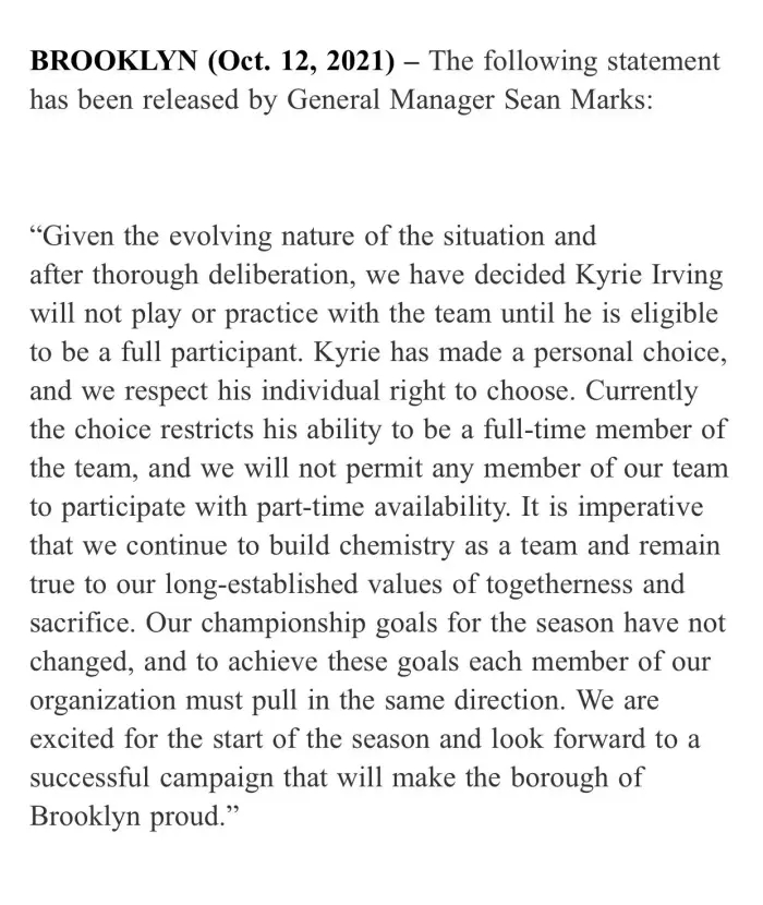 篮网总经理马克斯解释了一些细节“欧文已经明确地做出了自己的选择,我们完全尊重他的选择权,现在的这个决定则是对球队来说最好的一条路。决定是我和蔡崇信一起做的,之前与哈登、杜兰特进行了讨论沟通。我们还是希望,欧文能在某个时间点接种疫苗,然后回归球队。”