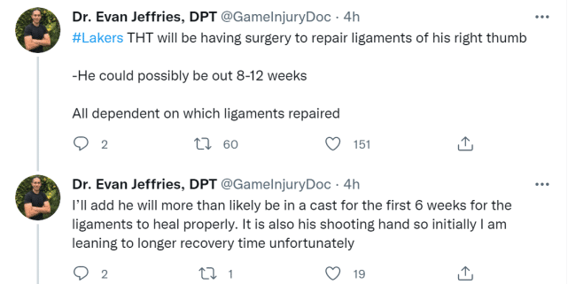 另一个医学专家Evan Jeffries就没那么乐观。他在社媒上写道:“霍顿-塔克可能要缺席8-12周的比赛,取决于受伤的具体韧带。为了韧带康复,他很可能在前6周需要打石膏固定,这还是他的投篮手,所以我的最初判断是要缺席更长的时间。”