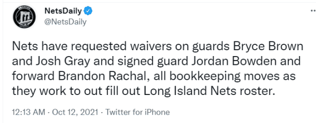 来源:JRS直播网10-12 14:54JRS直播网10月12日讯 ,据篮网媒体NetsDaily报道,篮网签下后卫乔丹-鲍登和前锋布兰登-雷查尔,裁掉了一天前签下的布莱斯-布朗和约什-格雷。新签的两名球员预计也会被裁掉,四人都将加入篮网下属的G联赛球队,成为新赛季的备胎。