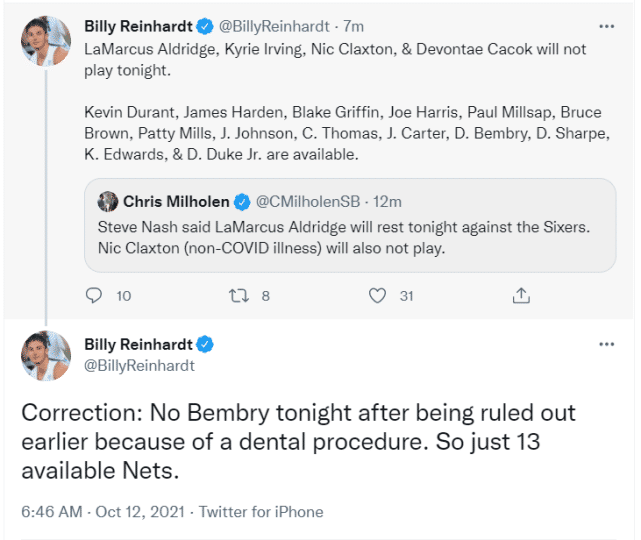 今天,篮网在客场对阵费城,打响季前赛第三战。此前两场季前赛,他们分别击败了湖人和雄鹿。据篮网前方记者报道,本场比赛,篮网将有五名球员不会出战。他们是阿尔德里奇、欧文、克拉克斯顿、卡考克和本布里。欧文没有随队来到费城,卡考克有伤在身,克拉克斯顿生病了(不是新冠),本布里要接受牙科手术,阿德是轮休。